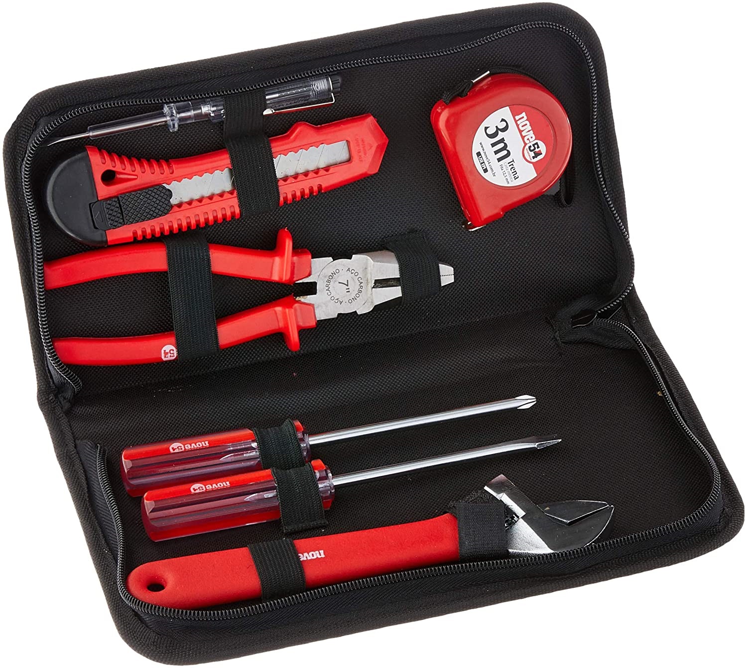 1 Jogo de ferramentas com 8 peças, sendo: 1 estojo em lona, 1 trena 3 m, 1 chave teste 1/8" x 5.1/2", 1 estilete 18 mm, 1 chave de fenda em aço carbono 6 mm x 100 mm, 1 chave de fenda cruzada/phillips em aço carbono 6 mm x 100 mm, 1 alicate universal em aço carbono 7" e 1 chave ajustável em aço carbono cromada 8"